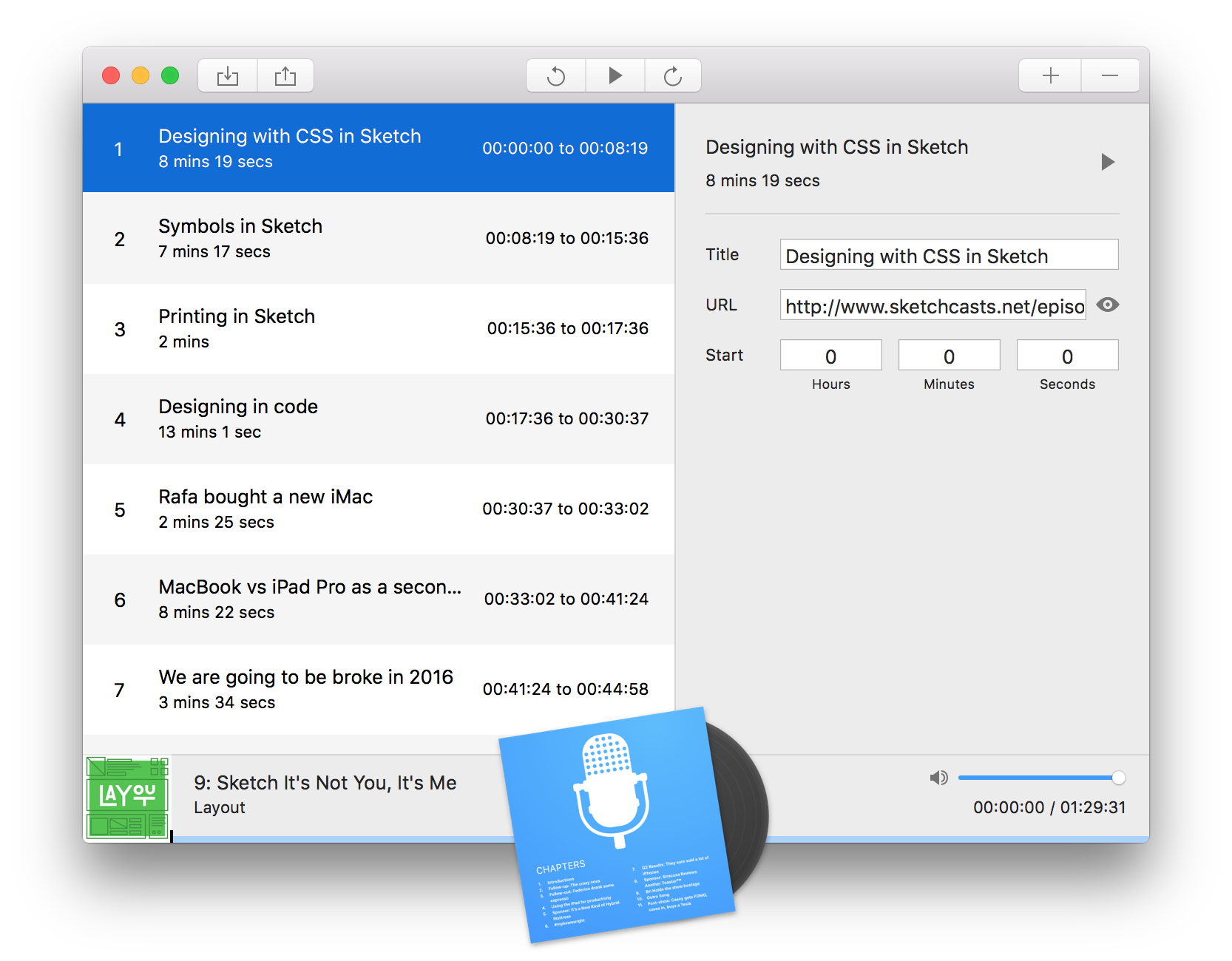 Thanks for purchasing Podcast Chapters, I really appreciate your support, and I hope you've found it useful so far! I'll be releasing updates here and there to add features and fix bugs. You can find a list of the changes so far on this page.
